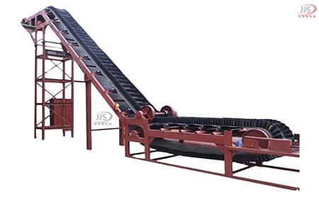 大傾角皮帶輸送機(jī)(擋邊帶式輸送機(jī))其結(jié)構(gòu)是在平形橡膠運(yùn)輸帶兩側(cè)粘上可自由伸縮的橡膠波形立式“裙邊”,在裙邊之間又粘有一定強(qiáng)度和彈性的橫隔板組成匣形斗,使物料在斗中進(jìn)行連續(xù)輸送。大傾角皮帶輸送機(jī)(擋邊帶式輸送機(jī))可廣泛用于煤炭、糧食、建材、化工、水電和冶金等部門,在環(huán)境溫度為-19℃~+40℃范圍內(nèi),輸送堆積比重為0.5-2.5t/m3的各種散狀物料。對于輸送有特殊要求的物料,如高溫、具有酸、堿性、油類物質(zhì)或有機(jī)溶劑等成分的物料,需采用特殊的擋邊輸送帶,是應(yīng)用范圍極廣、高效穩(wěn)定的提升輸送設(shè)備之一。